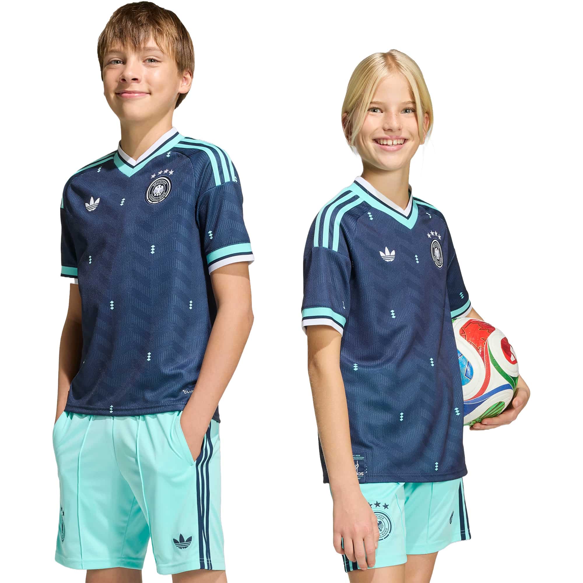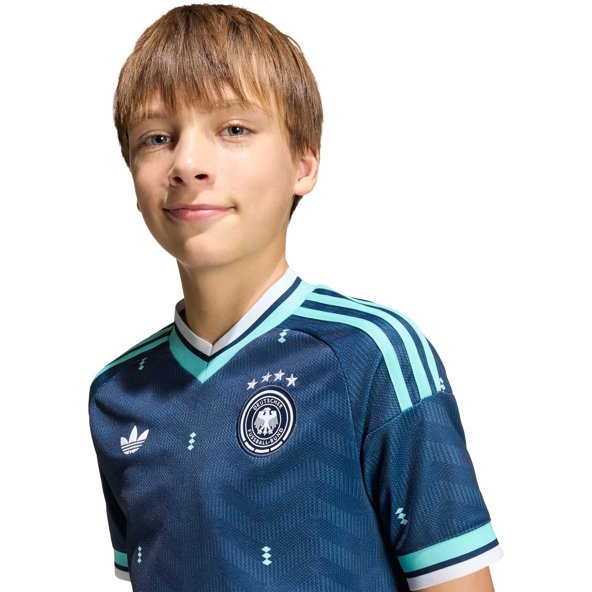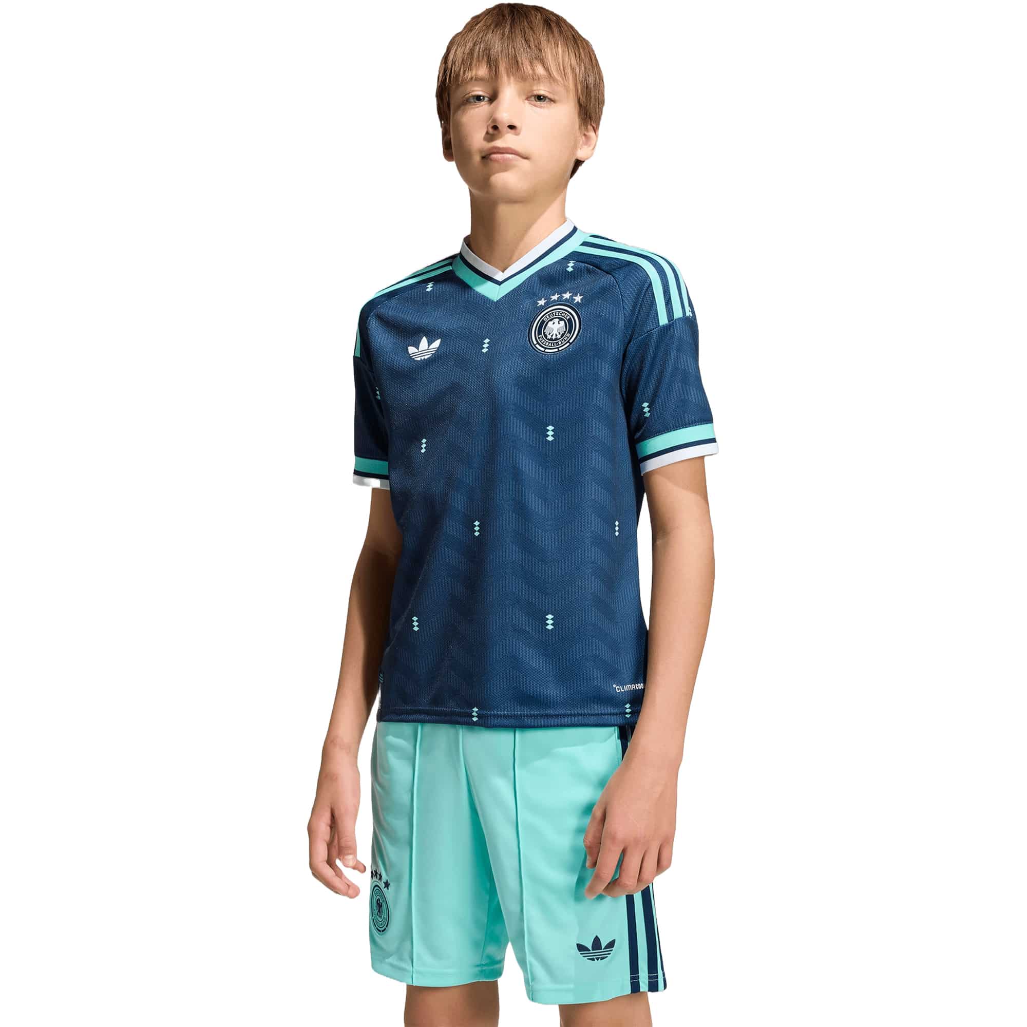Zeige die Leidenschaft für Fußball schon in jungen Jahren – mit dem Deutschland 26 Auswärtstrikot für Kids! Inspiriert von legendären Momenten der Nationalmannschaft, bringt dieses Trikot die Geschichte auf das Spielfeld der nächsten Generation. Die schmale Passform folgt jeder Bewegung, während der getapte V-Ausschnitt hohen Komfort und einen klassischen Fußball-Look bietet. CLIMACOOL hält dein Kind kühl und trocken, sodass es sich ganz auf das Spiel konzentrieren kann – egal, ob beim Training, in der Schule oder beim Jubeln am Spielfeldrand. Das aufgestickte adidas Logo, das Vereinswappen und das Flaggen-Label in den Nationalfarben machen das Trikot zu einem echten Statement für jeden Fan. Mit kultigen Designelementen und modernster Technologie fühlt sich jeder kleine Spieler wie ein Teil der Nationalmannschaft – bereit für Action, Tore und unvergessliche Momente!
