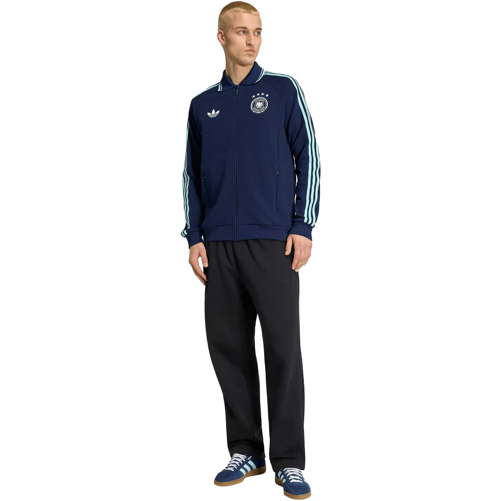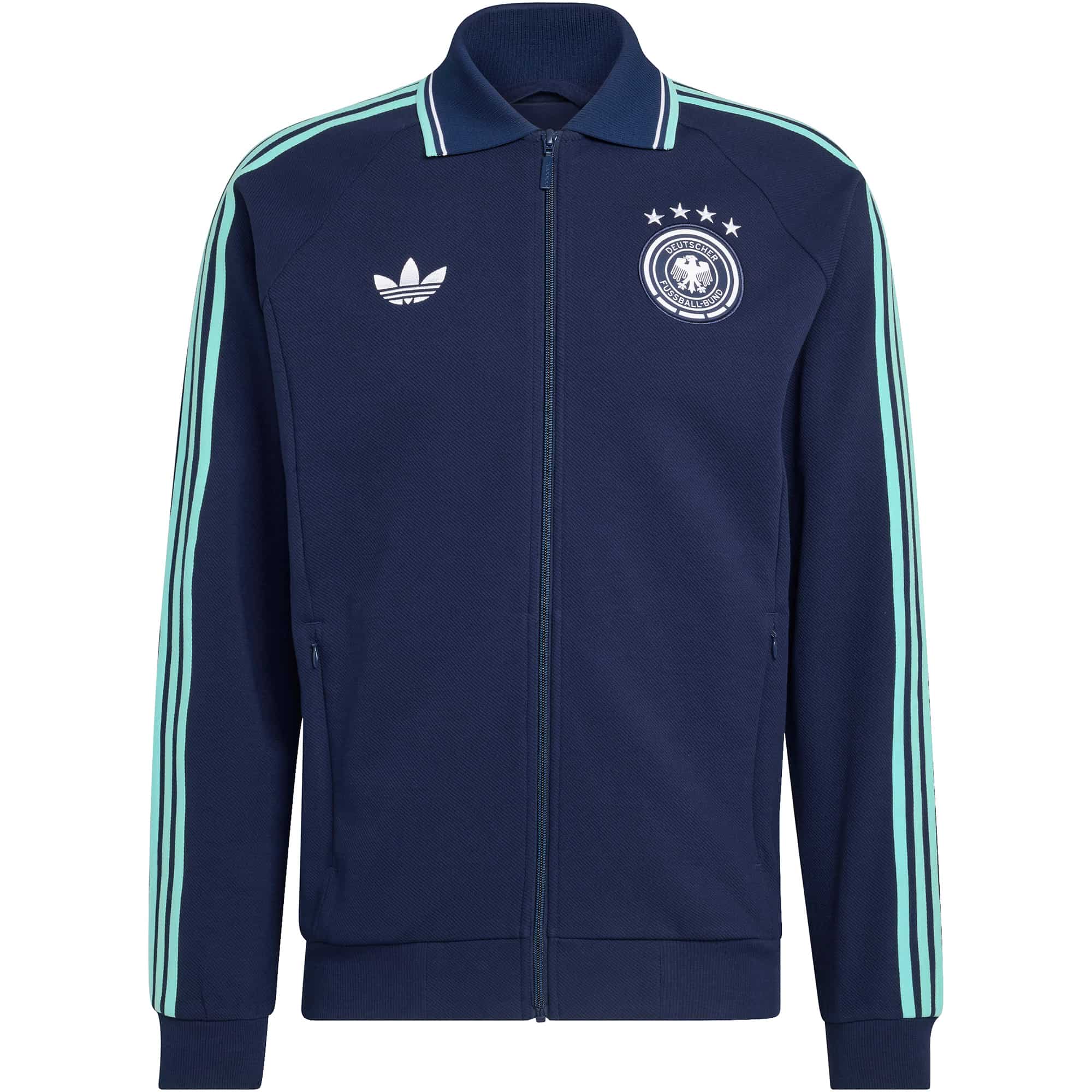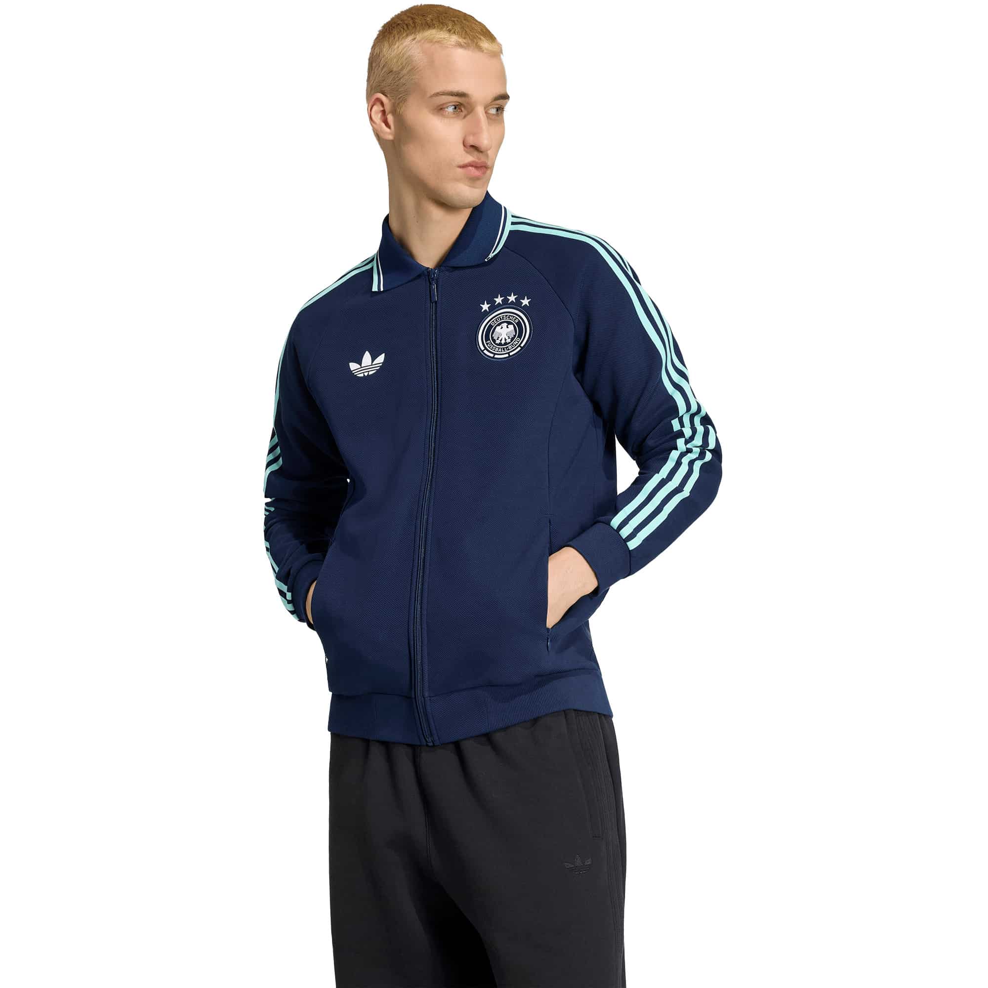 Die DFB Anthem Auswärtsjacke vereint Retro-Spirit mit modernem Design und richtet sich an Fans, die ihre Fußballleidenschaft auch abseits des Spielfelds zeigen möchten. Gefertigt aus hochwertigem Doppelstrickmaterial bietet sie ein angenehmes Tragegefühl, während der durchgehende Reißverschluss das unkomplizierte Layern ermöglicht. Der markante Kragen verleiht der Jacke einen zeitlosen Charakter, und das ikonische Trefoil Logo setzt einen klaren Akzent, der das Sportswear- und Streetwear-Erbe von adidas feiert. Ob auf der Tribüne, in der Stadt oder unterwegs im Alltag, diese Jacke macht jeden Look zu einem Statement und verbindet Fanliebe mit stylischem Fußball-Style.