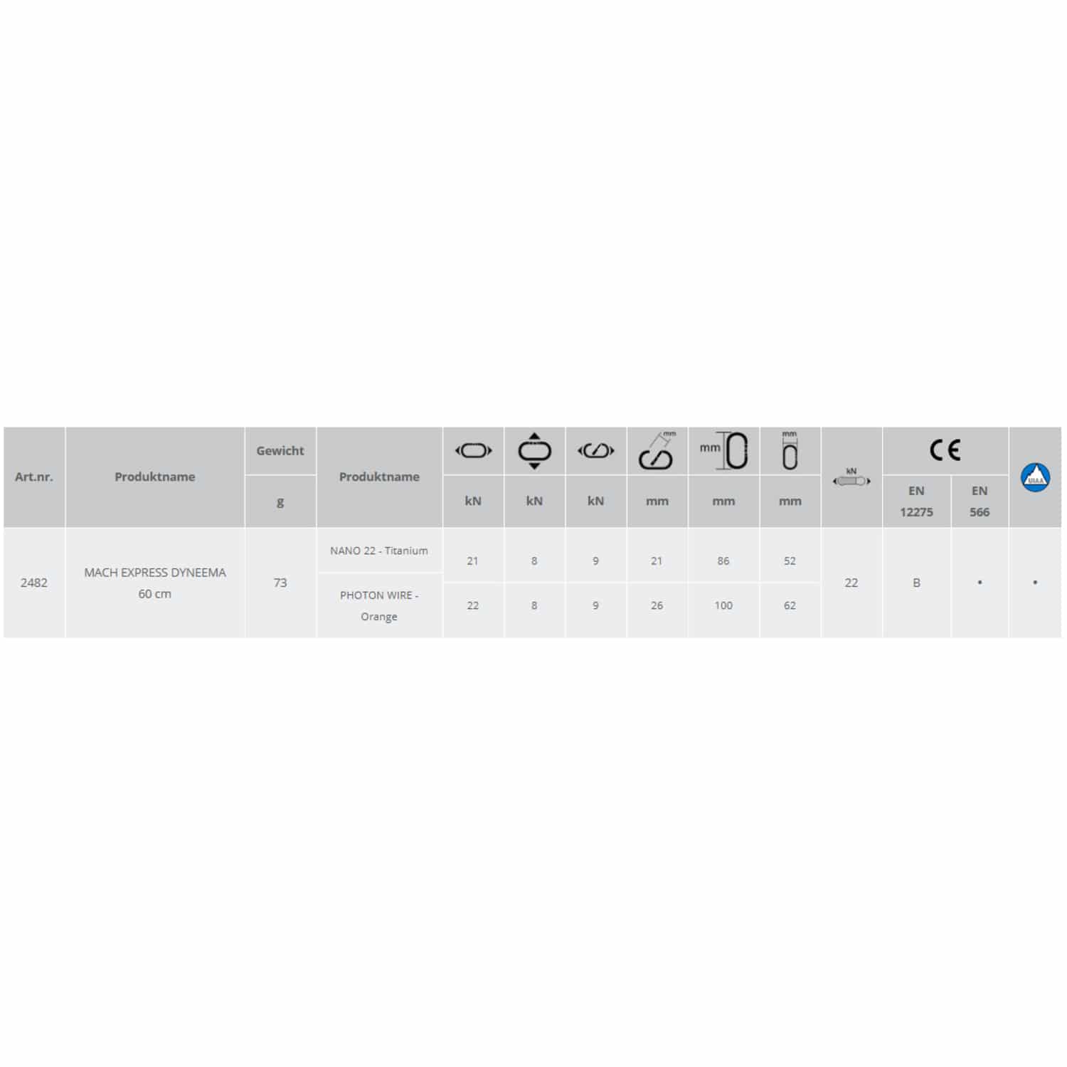 Das Mach Express Dyneema® 60 cm ist das ideale Express-Set für lange Gebirgsrouten. Das Set besteht aus einem Karabiner Nano 22 für die Verankerungen und einem Karabiner Photon Wire, durch den das Seil geführt wird. Die Bandschlinge aus Dyneema® ist leicht, widerstandsfähig sowie dünn und somit perfekt für Gebirgsrouten. Das verwendete Dyneema® ist im Gegensatz zu Polyester optimal für Umgebungen mit einer sehr hohen Luftfeuchtigkeit. Wenn die Dyneema®-Faser nass ist, behält sie die höchste Bruchfestigkeit und dank ihrer wasserabweisenden Eigenschaften hindert sie die Bandschlinge daran, Wasser aufzusaugen und zu gefrieren.