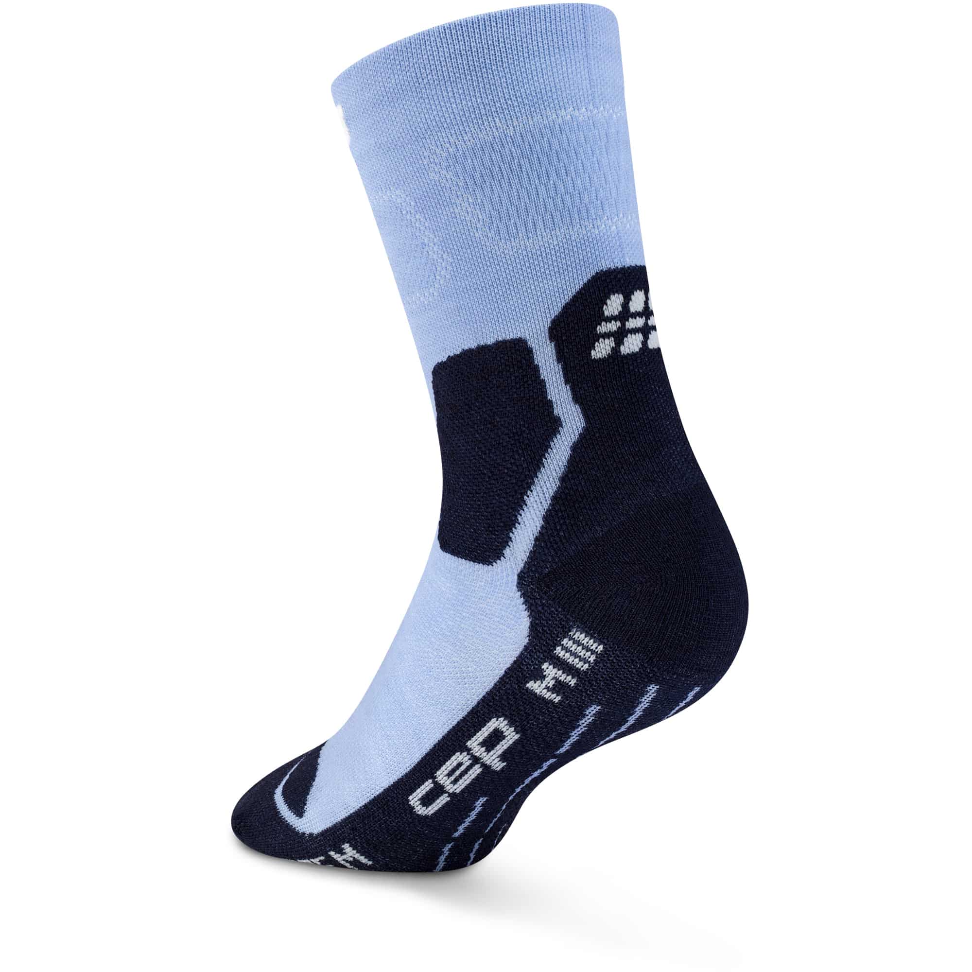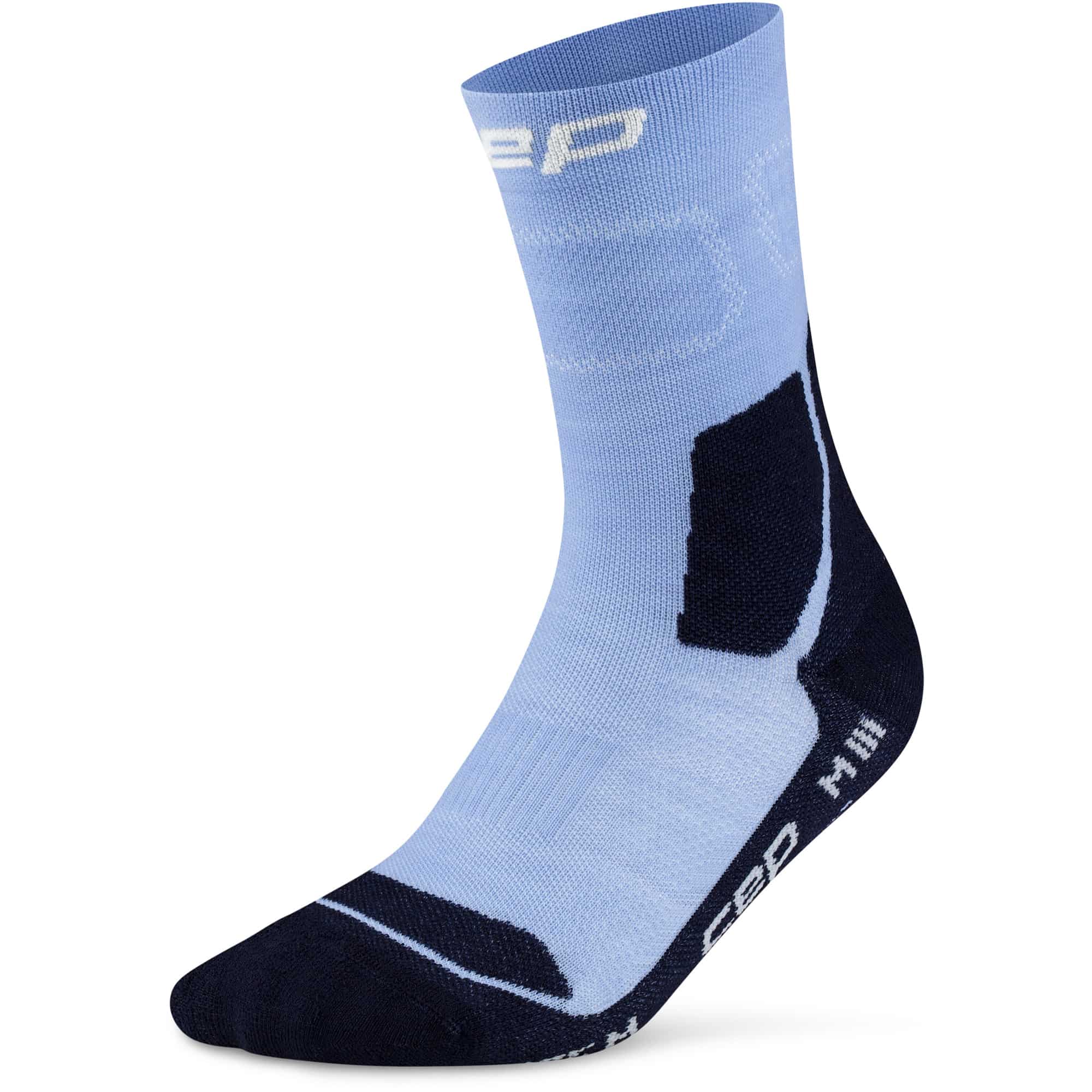 Die Hiking Light Cushion Mid Cut Wandersocken für Damen von CEP vereinen gezielte Polsterung mit maximaler Atmungsaktivität in einem leichten, schlanken Design und sind ideal für Wanderungen bei warmem Wetter und in leichten Schuhen. Die in Deutschland gefertigten Socken nutzen die charakteristische 3D-Kompressionstechnologie, die präzise Aktivierungs- und Unterstützungszonen bietet und für einen sicheren, enganliegenden Sitz sorgt, der ein Verrutschen und Reiben verhindert. Anatomisch platzierte Polsterungen im Fußbereich erhöhen den Tragekomfort, während das Merino-Mischgarn für natürliche Temperaturregulierung und Atmungsaktivität sorgt. Profilierte Belüftungskanäle leiten Wärme und Feuchtigkeit effizient ab, die feuchtigkeitsableitende Funktion transportiert Schweiß von der Haut weg, sodass die Füße trocken bleiben. Die dreidimensionale Oberfläche sorgt für zusätzlichen Grip und Stabilität, und die speziell angepasste Zehenbox bietet mehr Komfort und Bewegungsfreiheit. Mit diesen Mid-Cut-Wandersocken erhält man eine durchdachte Kombination aus Funktionalität, Komfort und Passform, ideal für leichte Wanderungen bei warmen Bedingungen.