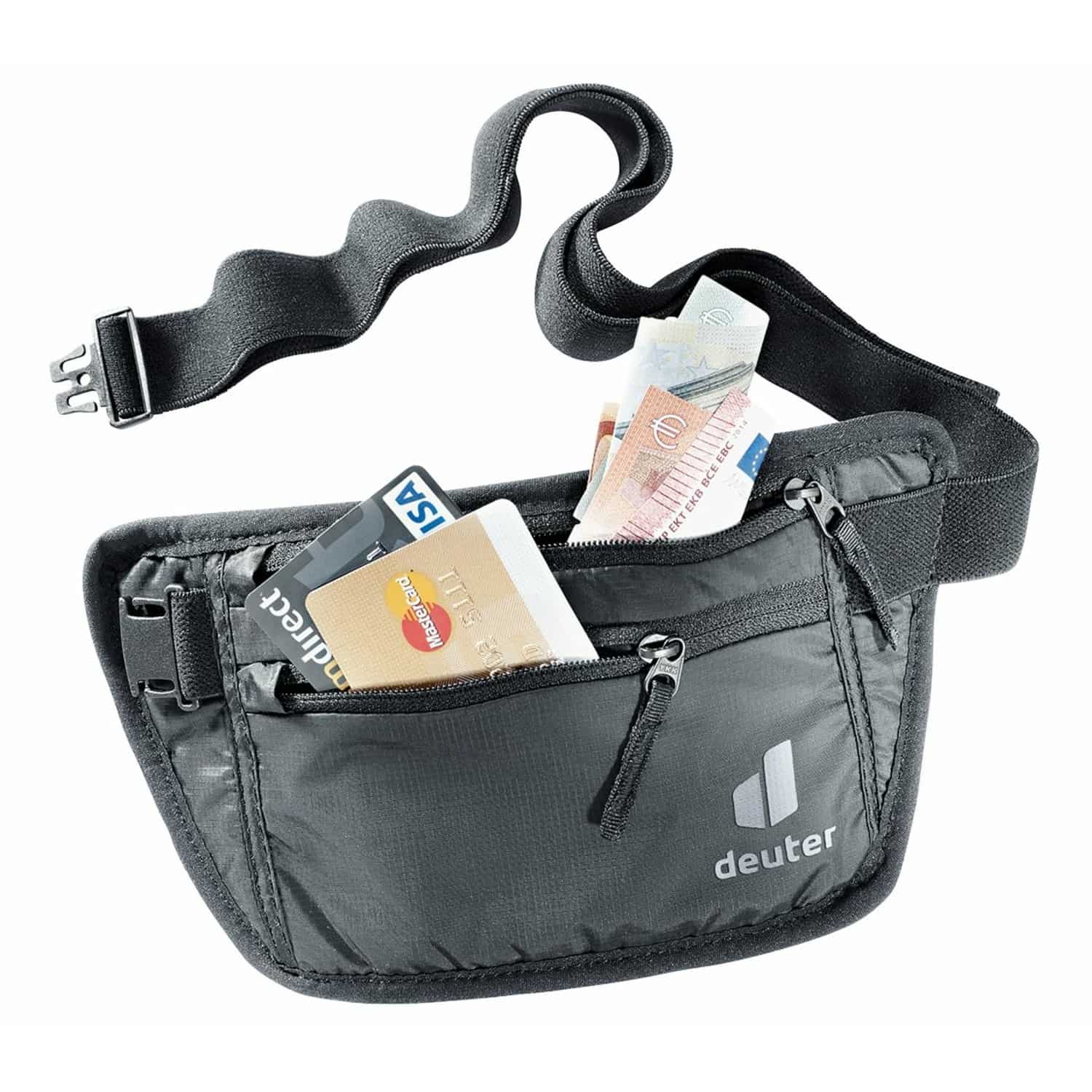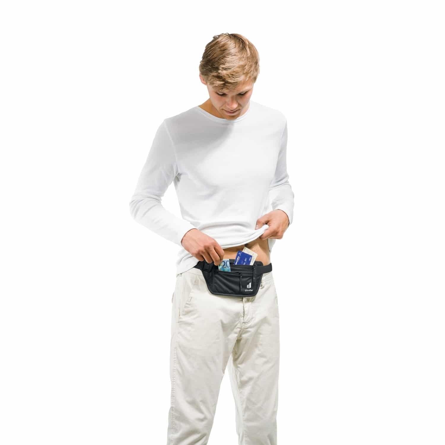 Der Security Money Belt I von Deuter wird um die Hüfte getragen. Die Bauchtasche hat zwei Reißverschlusstaschen für Reisepass, Dokumente, Karten und Bargeld. Der Hüftgurt kann verstellt werden. Das robuste Material ist waschbar.