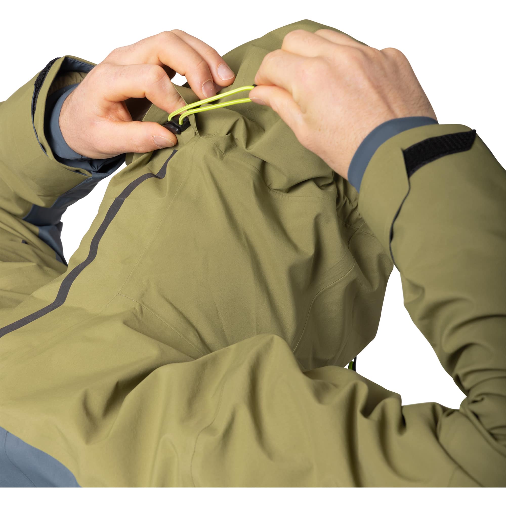Die helmkompatible, verstellbare Kapuze, vollständig versiegelte Nähte und strategisch platzierte Belüftungsöffnungen machen die Jacke besonders funktional für intensive Aktivitäten am Berg.