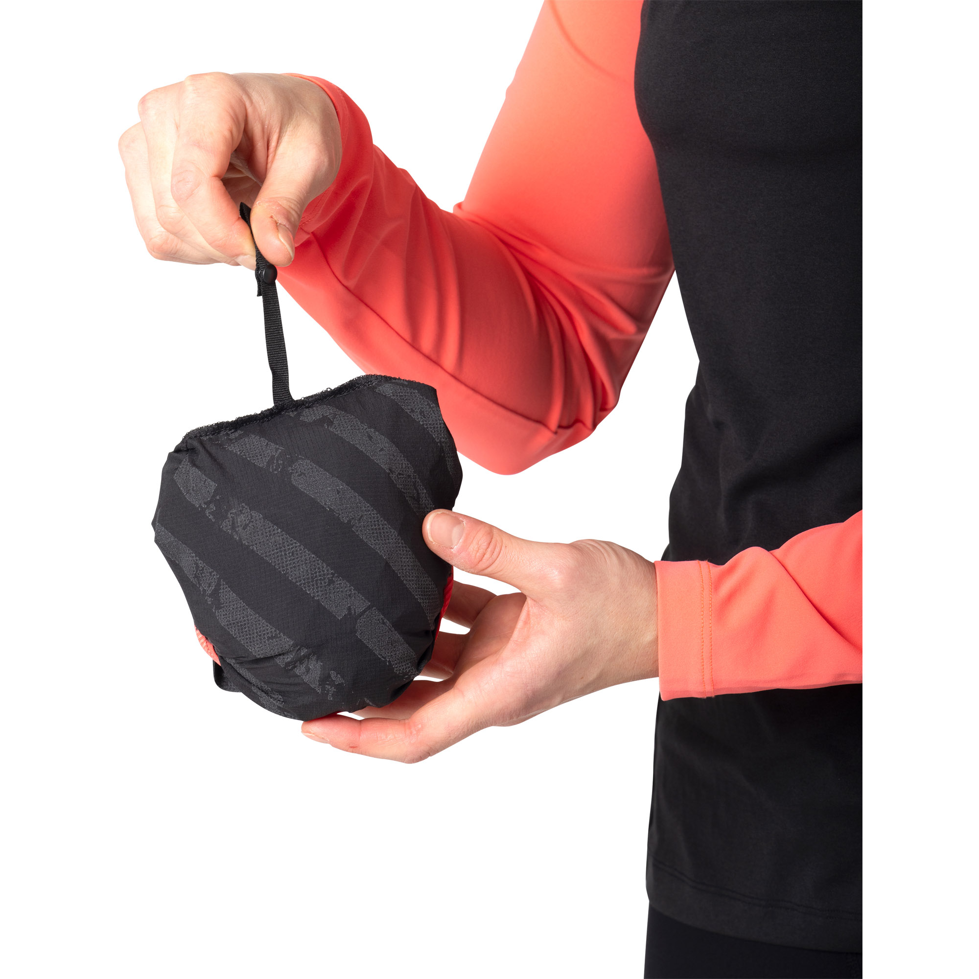 Bei Bedarf kann man die eng anliegende Kapuze aufrollen und fixieren sowie die Jacke weit öffnen und lediglich mit einem Druckknopf auf Brusthöhe fixieren.