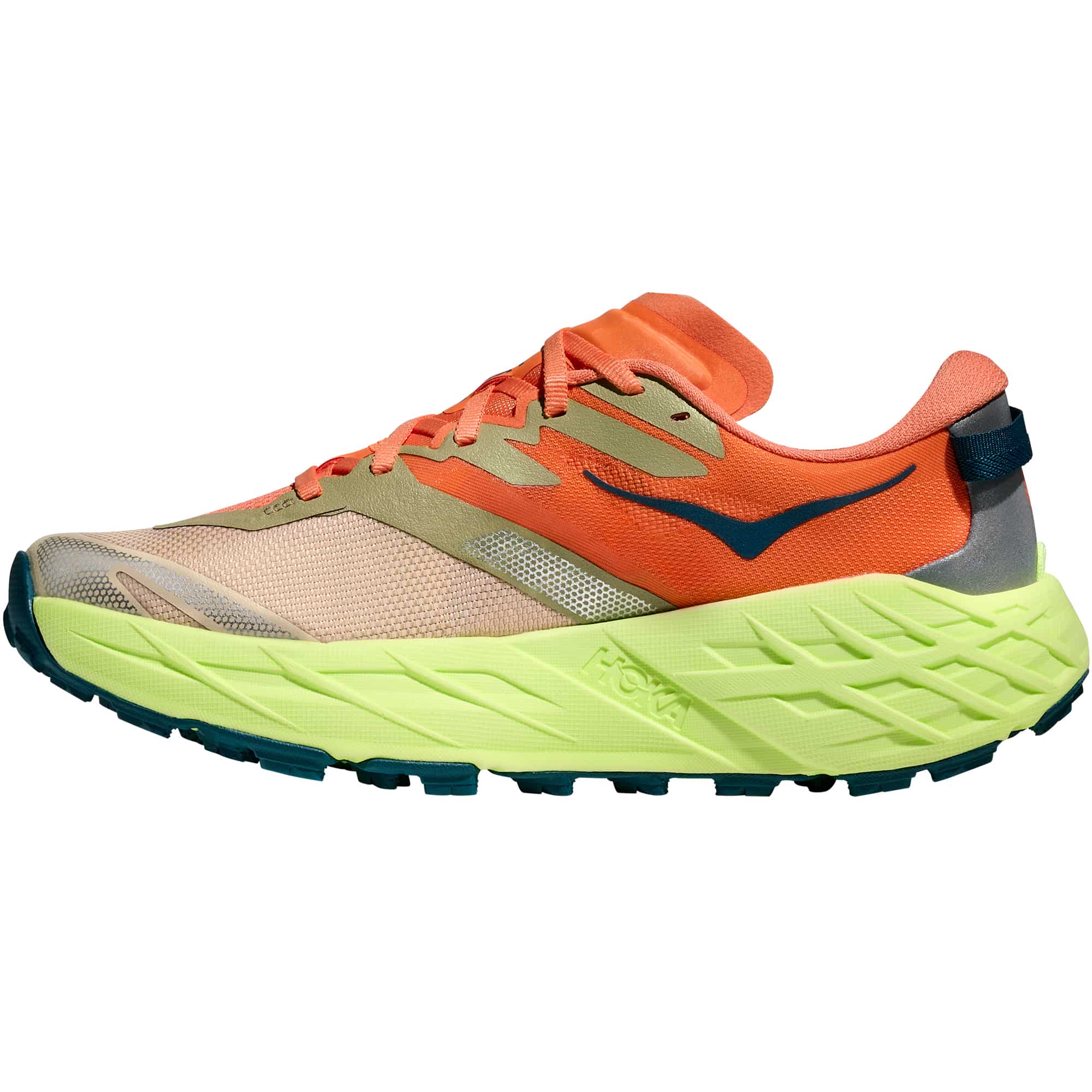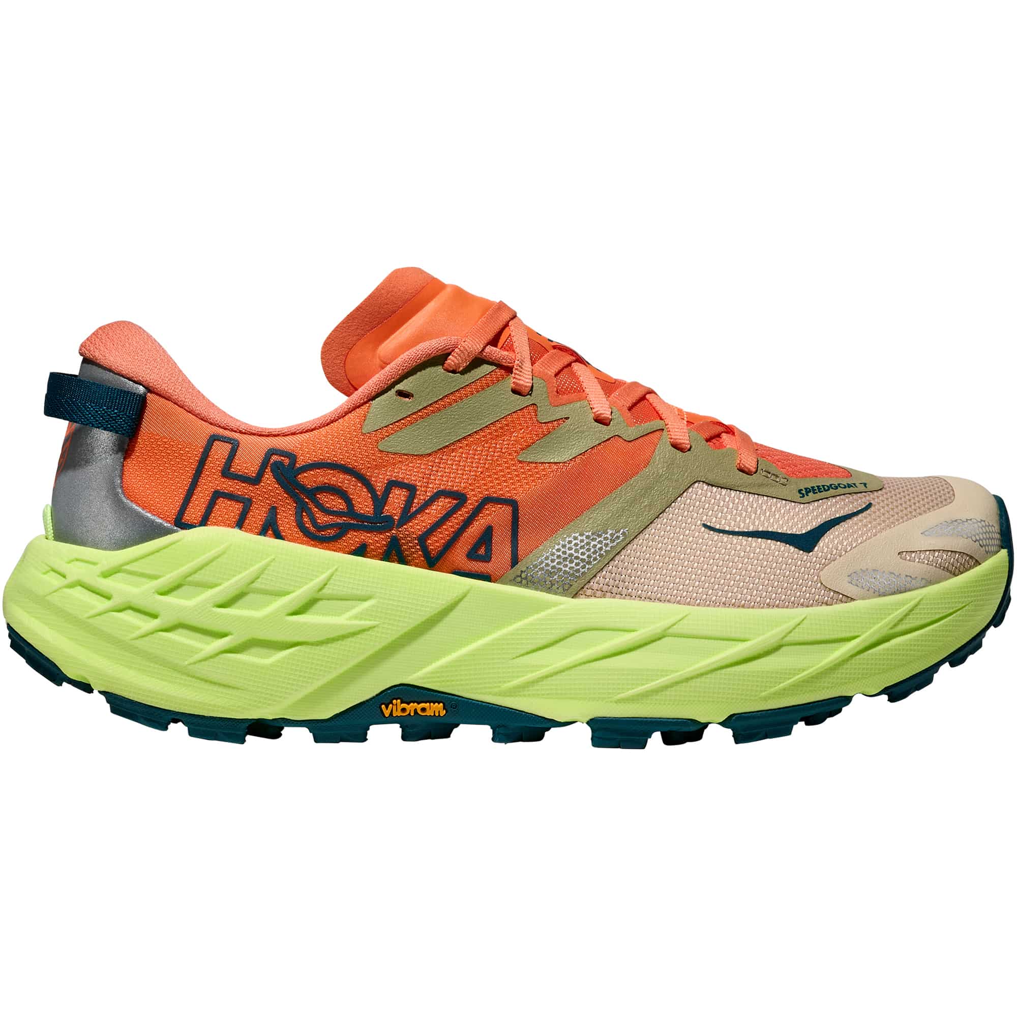 Der HOKA Speedgoat 7 Damen Trailrunningschuh ist für anspruchsvolles, technisches Gelände konzipiert und bietet hohe Griffigkeit sowie ein direktes Laufverhalten. Die neu eingesetzte EVA-Zwischensohle sorgt für eine verbesserte Energierückgabe und eine höhere Reaktionsfreudigkeit, während Passform und Traktion des bewährten Modells erhalten bleiben. Das leichte Obermaterial aus Webtextil mit elastischem Vorfußbereich unterstützt eine präzise und stabile Passform, ergänzt durch eine flach anliegende Zunge mit doppeltem Einsatz zur gleichmäßigen Druckverteilung. Der überarbeitete Fersenkragen erhöht den Tragekomfort, eine integrierte Befestigung für Gamaschen erweitert den Einsatzbereich. Reflektierende Elemente verbessern die Sichtbarkeit bei schlechten Lichtverhältnissen. Die Außensohle aus Vibram® Megagrip mit neu angeordneter Profilstruktur und 5 mm tiefen Stollen bietet zuverlässigen Halt auf wechselndem Untergrund. Durch die technischen Überarbeitungen bleibt der Speedgoat ein leistungsorientierter Trailschuh für vielseitige Einsätze im Gelände.