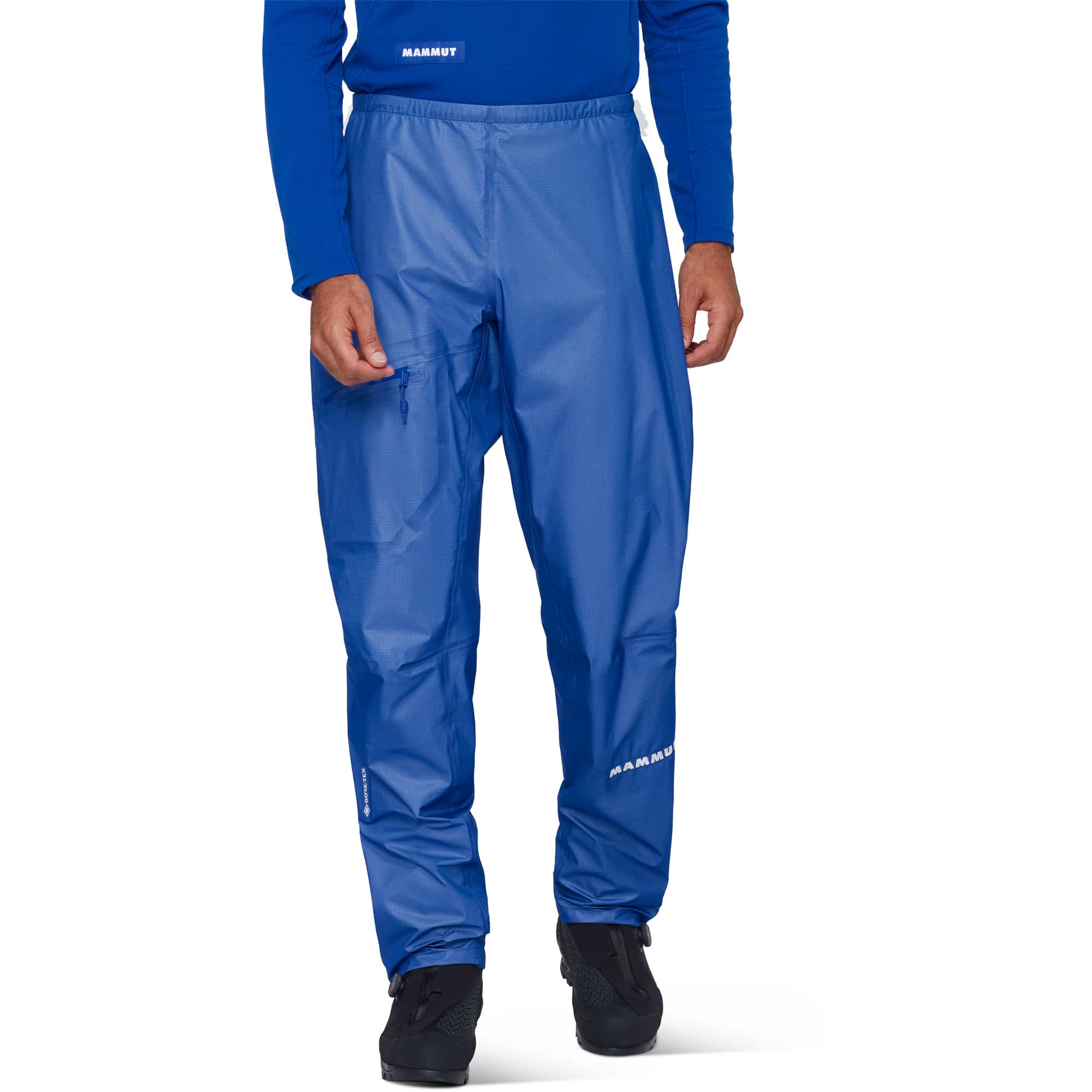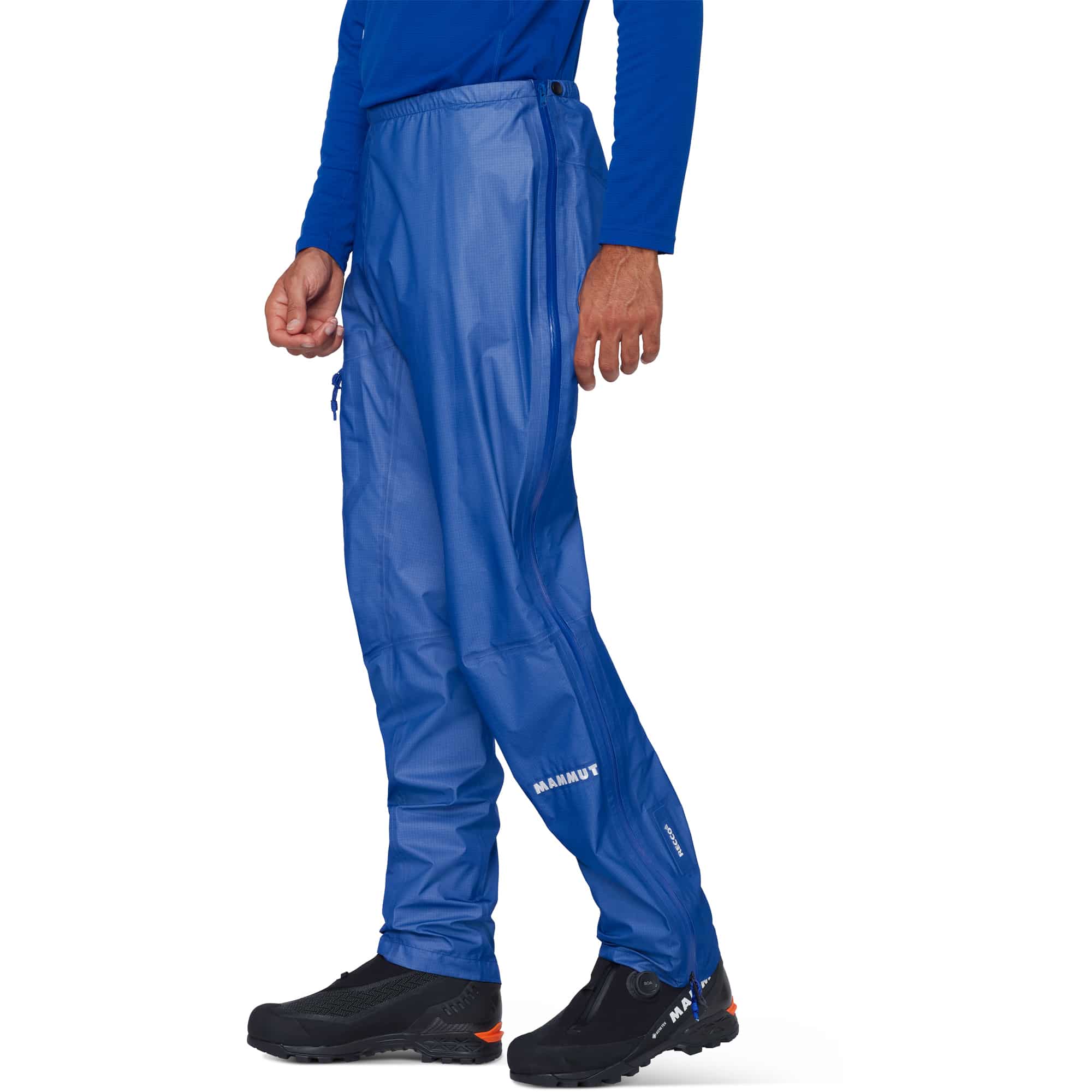 Die Mammut Eiger Nordwand Light Regenhose für Herren ist eine ultraleichte Hardshellhose, die speziell für anspruchsvolle Berg- und Klettertouren entwickelt wurde und durch minimalistisches Design, hohe Atmungsaktivität und hervorragende Verstaubarkeit überzeugt. Das robuste GORE-TEX 3-Lagen-Laminat bietet wasserdichten, winddichten und abriebfesten Schutz auf Expeditionsniveau, während das C-KNIT® Innenmaterial aus recyceltem Nylon Tragekomfort garantiert. Die vorgeformte, klettergerechte Passform, der schmal zulaufende Schnitt über den Bergschuhen sowie die durchgehenden Seitenreißverschlüsse ermöglichen ein schnelles An- und Ausziehen, während der elastische Bund mit Kordel und die klettergurtkompatible Oberschenkeltasche flexible Anpassungsmöglichkeiten bieten. Ergänzt wird die Hose durch RECCO-Reflektor, Schnürsenkelhaken an den Beinabschlüssen sowie reparaturfreundliche Verarbeitung mit Flickzeug für unterwegs. Mit ihrem geringen Gewicht ist diese Hose die ideale Wahl für Bergsteigen, alpine Klettertouren, Skitouren und Speed-Mountaineering, die maximale Bewegungsfreiheit, Schutz und Funktionalität bei allen Outdoor-Abenteuern sicherstellt.