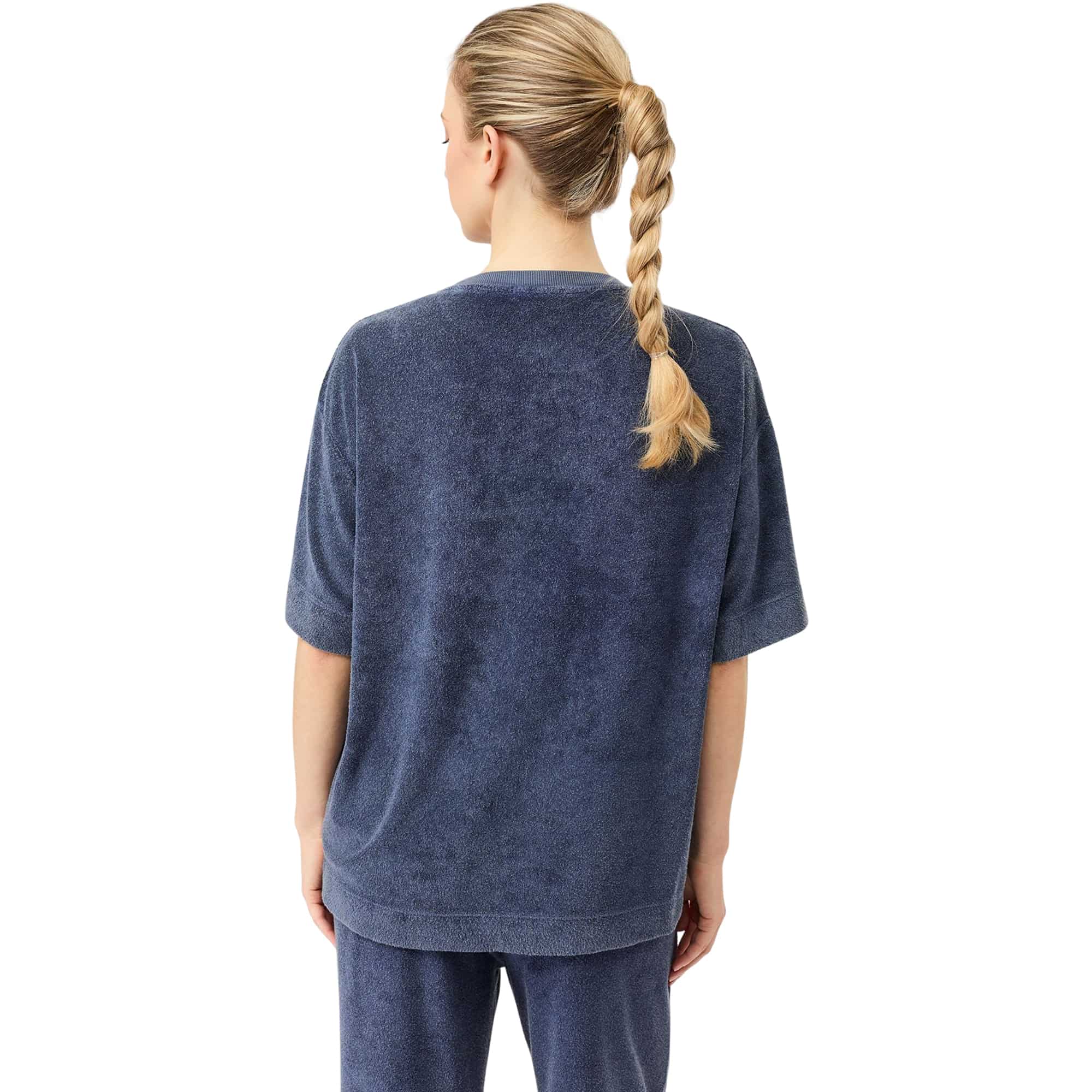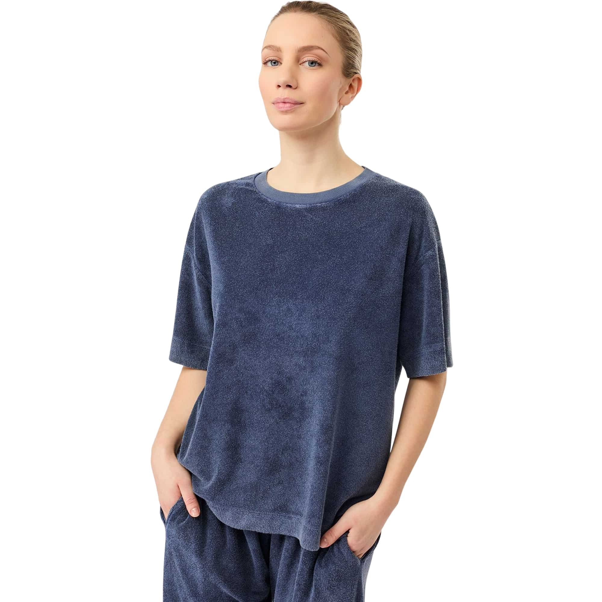 Dieses lässige Longshirt überzeugt mit einer entspannten, langen Passform bis über den Po und bietet maximalen Komfort für Alltag, Lounge, Strand oder leichte Workouts. Der gerade Schnitt mit halblangen, weich fallenden Ärmeln sorgt für eine moderne Silhouette, während Rundhalsausschnitt, überschnittene Schultern und feine Seitenschlitze zusätzliche Bewegungsfreiheit und einen lockeren Look ermöglichen. Das weiche Frottee-Material mit leicht angerauter Oberfläche fühlt sich besonders angenehm auf der Haut an und verleiht dem Shirt eine hochwertige, entspannte Optik im stückgefärbten Finish. Gefertigt aus einer soften Mischung aus Viskose (aus Bambus), Baumwolle und recyceltem Polyester ist es atmungsaktiv, elastisch und vielseitig einsetzbar – ideal für aktive und entspannte Tage zugleich.