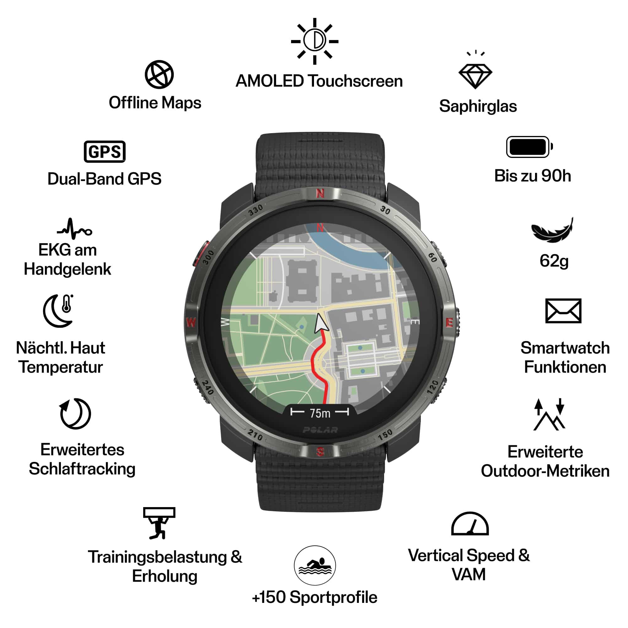 Polar Grit X2 ist eine kompakte, leichte und voll ausgestattete Outdoor-Uhr – gemacht für große Abenteuer und starke Leistungen im Alltag. Diese Outdoor-Sportuhr wurde für das Leben auf und abseits der Wege entwickelt und bietet fortschrittliche Trainings-, Schlaf- und Erholungstools, Biosense-Technologie, ein AMOLED-Display mit kratzfestem Saphirglas sowie präzise Dual-Frequenz-GPS-Navigation mit vollfarbigen Karten. Sie verfügt über eine extrem lange Akkulaufzeit von bis zu 7 Tagen im Smartwatch-Modus. Die Grit X2 ist etwas kleiner als die Pro-Version, bleibt aber ein echtes Kraftpaket für Outdoor-Abenteuer und bietet die ganze Bandbreite wissenschaftlich fundierter Trainings- und Erholungsfunktionen. Ob in unwegsamem Gelände, auf entlegenen Gebirgspfaden oder in der Stadt – mit der Grit X2 findest du stets den richtigen Weg. Polars fortschrittlichste Biosensorik liefert präzise Einblicke in Herzgesundheit, Erholung und Anpassung an extreme Bedingungen. Zusätzliche Features wie Smartphone-Benachrichtigungen, Musiksteuerung, Find My Phone, Wettervorhersage, Tageslichtzeiten und Sprachansagen sind noch mehr Gründe, die GritX 2 zu lieben.