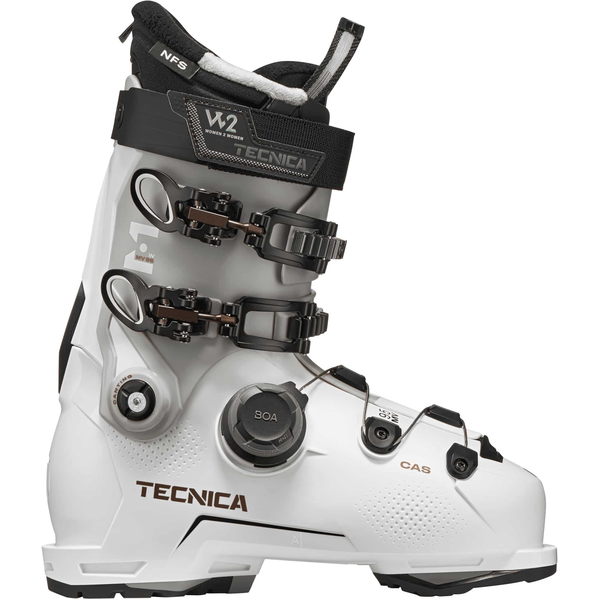 Der Tecnica MACH BOA MV 95 GW 25/26 Damen Skischuh ist ein Skischuh, der Komfort, Präzision und einfache Handhabung für den alpinen Pistenbereich vereint. Die mittelvolumige C.A.S. Schale und der anatomisch geformte Innenschuh bieten schon beim Kauf eine exzellente Passform, die sich individuell durch thermische Anpassung, Ausdrücken oder Schleifen optimieren lässt. Das BOA® Fit System sorgt für eine mikroeinstellbare, präzise Passform und sicheren Fersenhalt, während die GripWalk®-Sohle sicheren Halt beim Gehen auf Schnee und Eis bietet. Mit Quick Instep und Lift-Lock Schnallen ist das An- und Ausziehen besonders komfortabel, der 35 mm Klettverschluss stabilisiert den Fuß zusätzlich. Mit einem Flexindex von 95, einem mittleren Volumen (100 MV) und 12° Gehfunktion ist er ideal für sportliche Skifahrerinnen, die Komfort, Kontrolle und einfache Anpassbarkeit auf der Piste suchen.