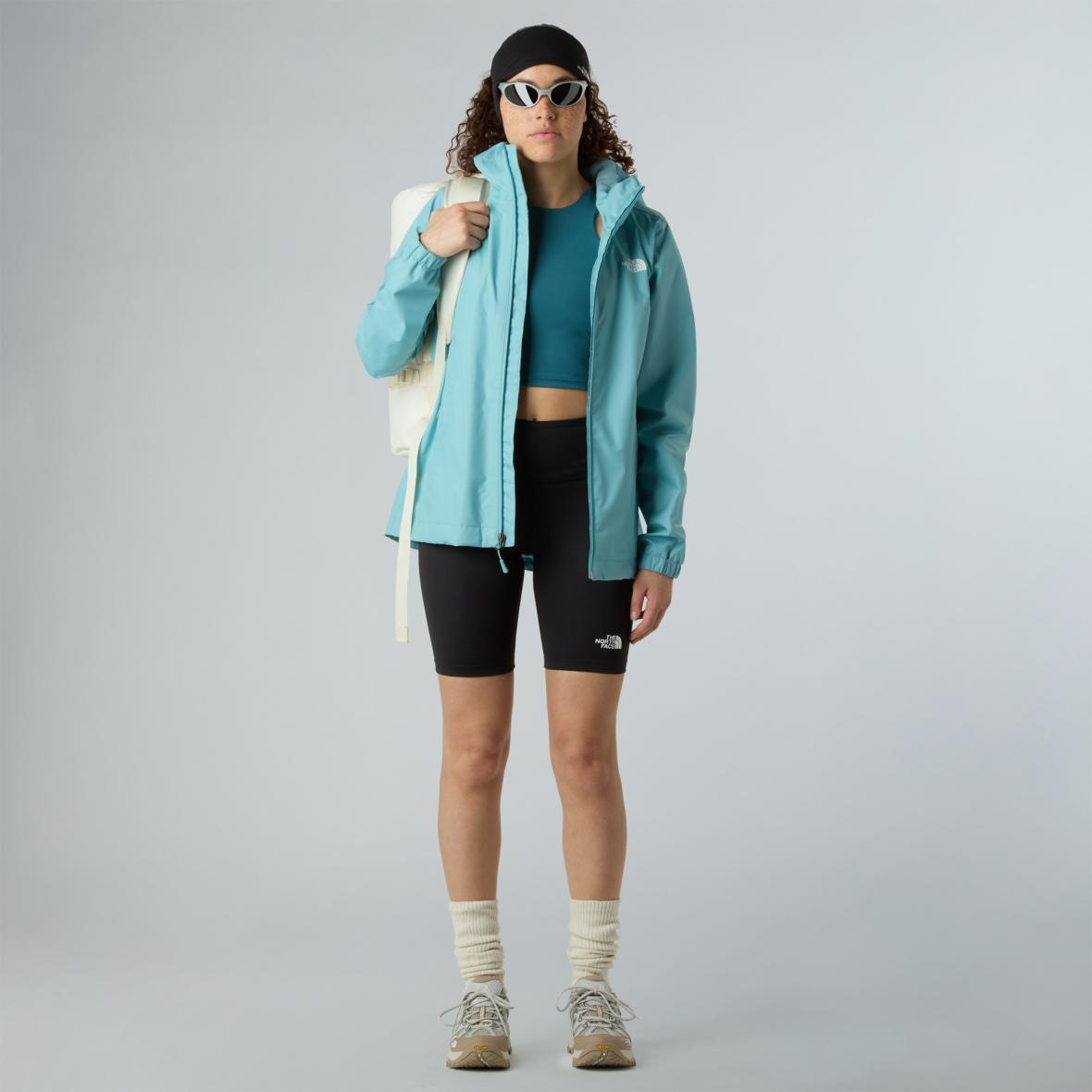 Die Quest Damen Wanderjacke von The North Face bietet zuverlässigen Schutz bei wechselhaftem Wetter. Sie besteht aus leichtem, zweilagigem DryVent™-Material mit versiegelten Nähten und wasserabweisender Beschichtung – ideal bei Wind und Regen. Das Material ist atmungsaktiv und sorgt für ein angenehmes Trageklima beim Wandern oder im Alltag. Die Jacke verfügt über eine fest angenähte, verstellbare Kapuze, elastische Ärmelabschlüsse und Cinch-Stopper am Saum für einen sicheren Sitz und zusätzlichen Wetterschutz. Zwei seitliche Reißverschlusstaschen bieten Stauraum, während der Kinnschutz aus weichem Material Hautirritationen durch den Reißverschluss verhindert.