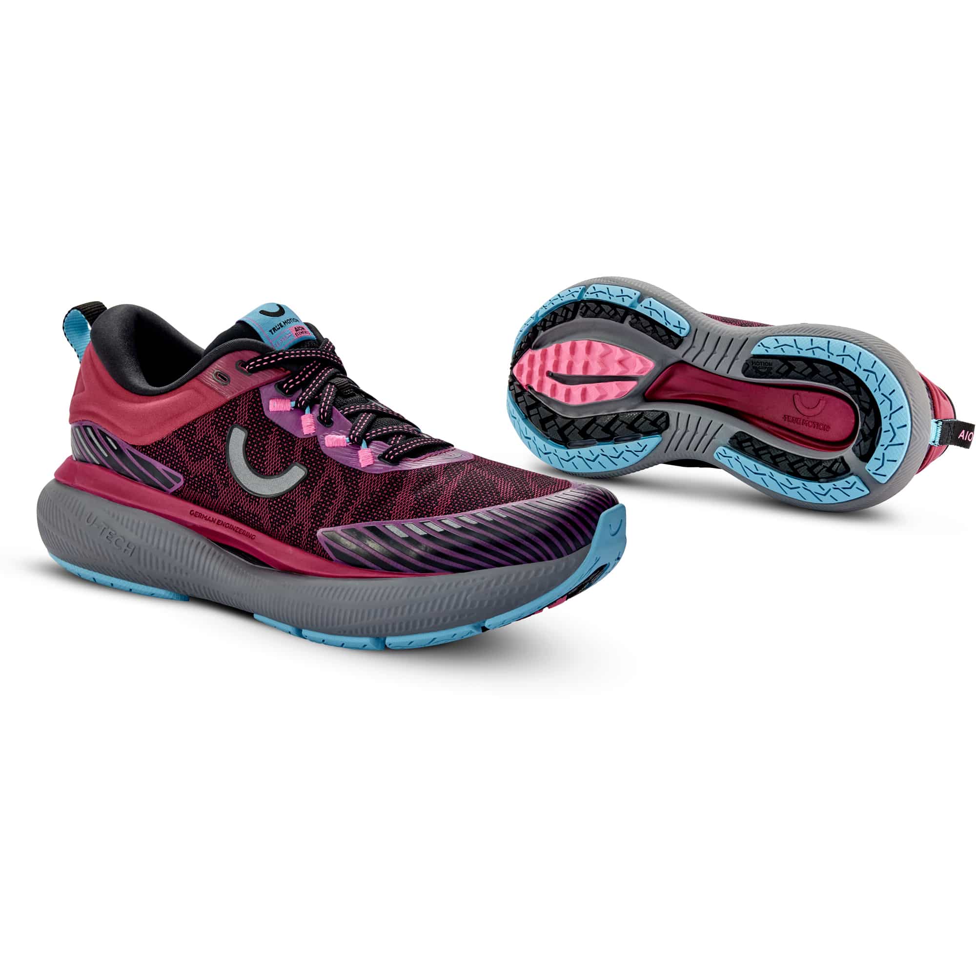 Die True Motion Aion Elements Damen Laufschuhe bieten die perfekte Kombination aus Komfort und Leistung für Läuferinnen aller Levels und sind für kurze, lange und ultralange Läufe geeignet. Ihr leichtes und flexibles Design und der U-TECH™ Foam ermöglichen natürliche Bewegungen und ein runderes, weicheres Laufgefühl bei jedem Schritt. Die neu entwickelte multidirektionale MotionGrip Technologie der Außensohle macht den U-TECH Aion Elements zum perfekten Hybridlaufschuh. Sie sorgt zuverlässig für maximalen Halt im Gelände und gleichzeitig für Rutschfestigkeit auf nassen Straßen. Das atmungsaktive Obermaterial bietet optimale Belüftung, damit deine Füße kühl und trocken bleiben, egal wie lange deine Laufeinheiten sind. Mit diesen Laufschuhen erreichst du deine Ziele mit Leichtigkeit und Komfort.