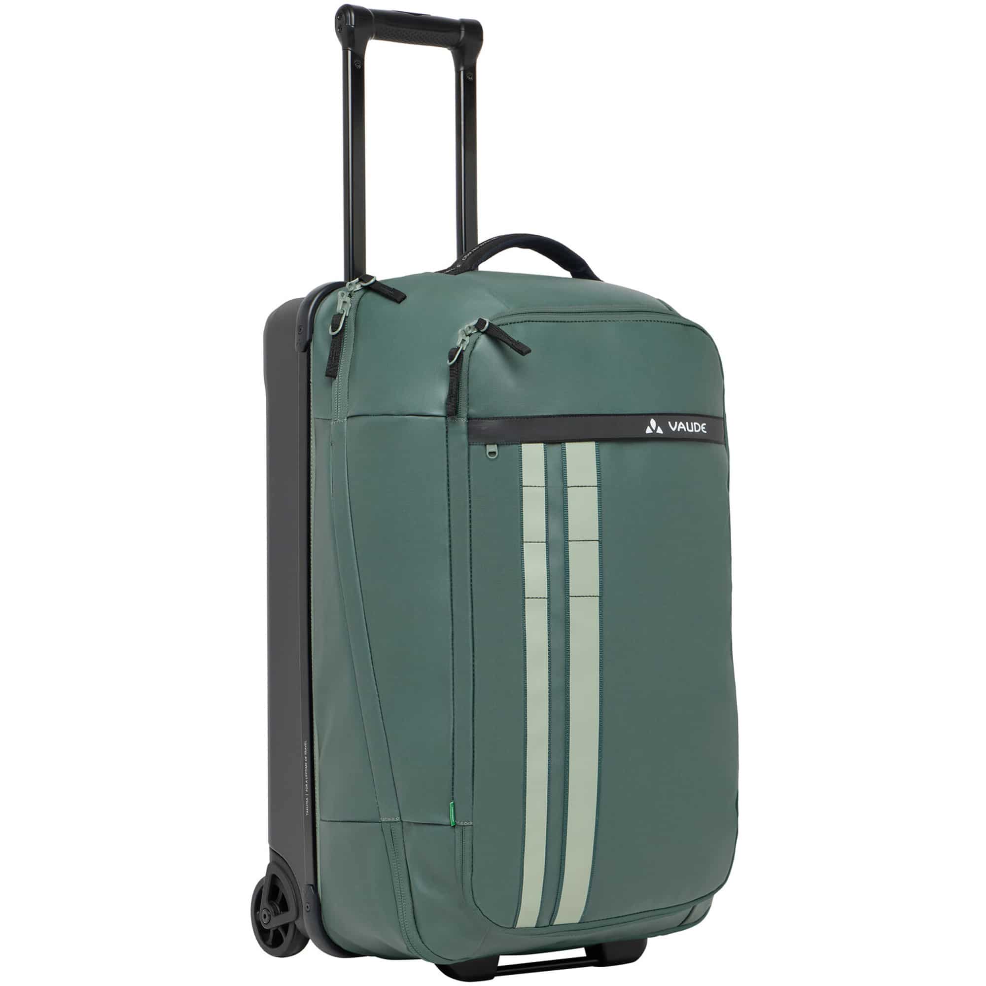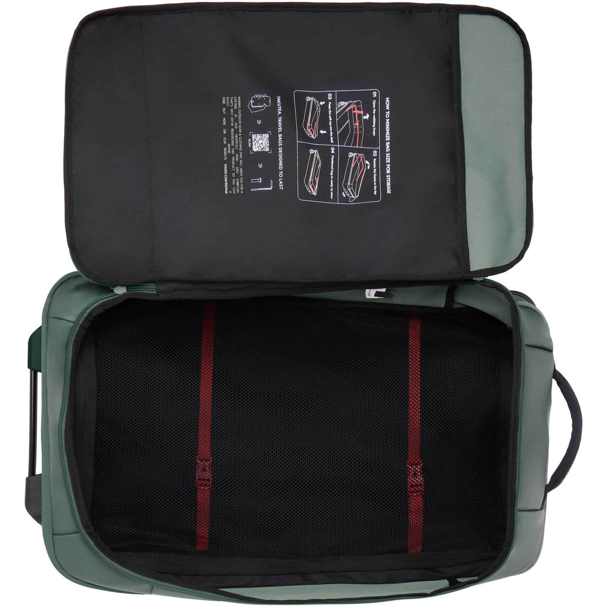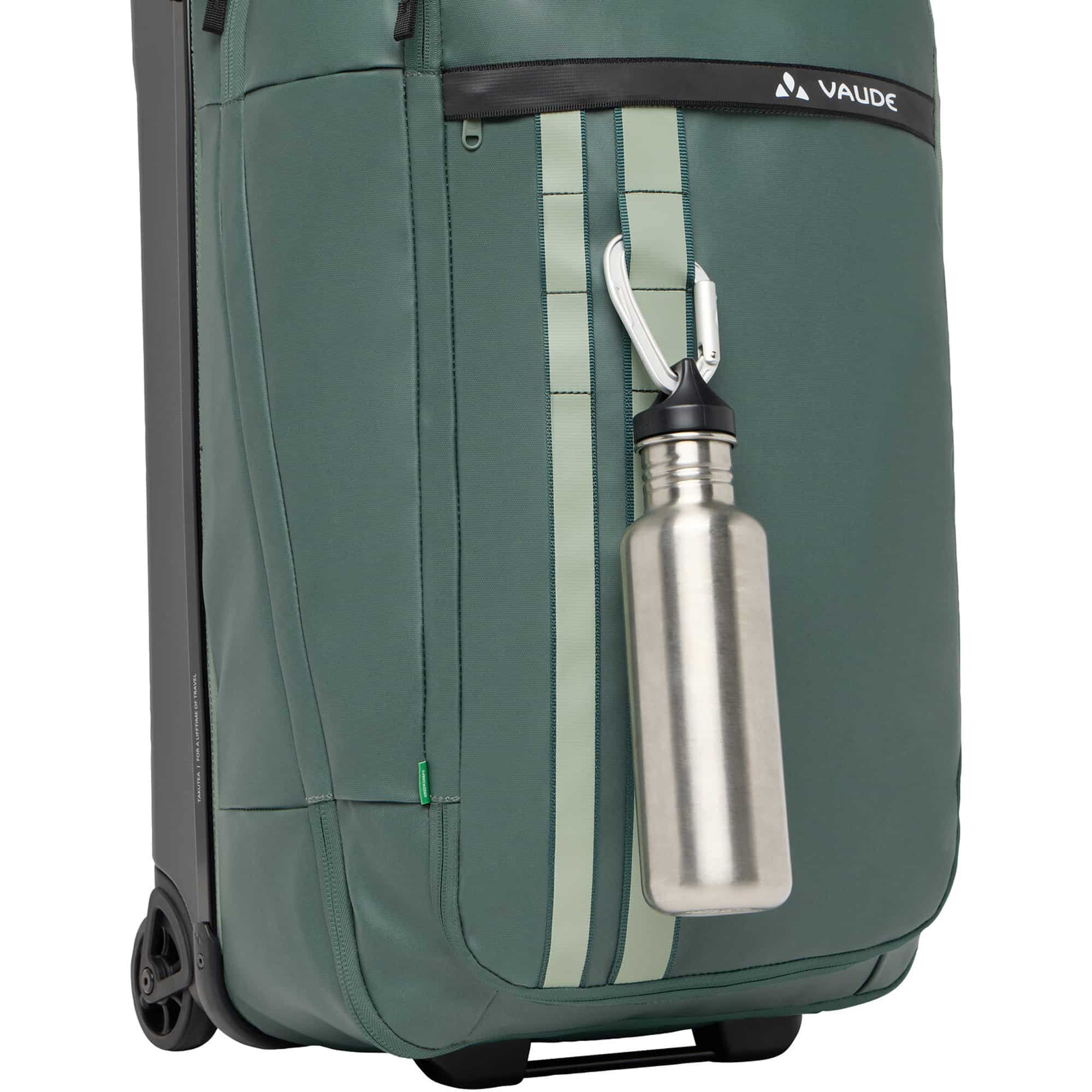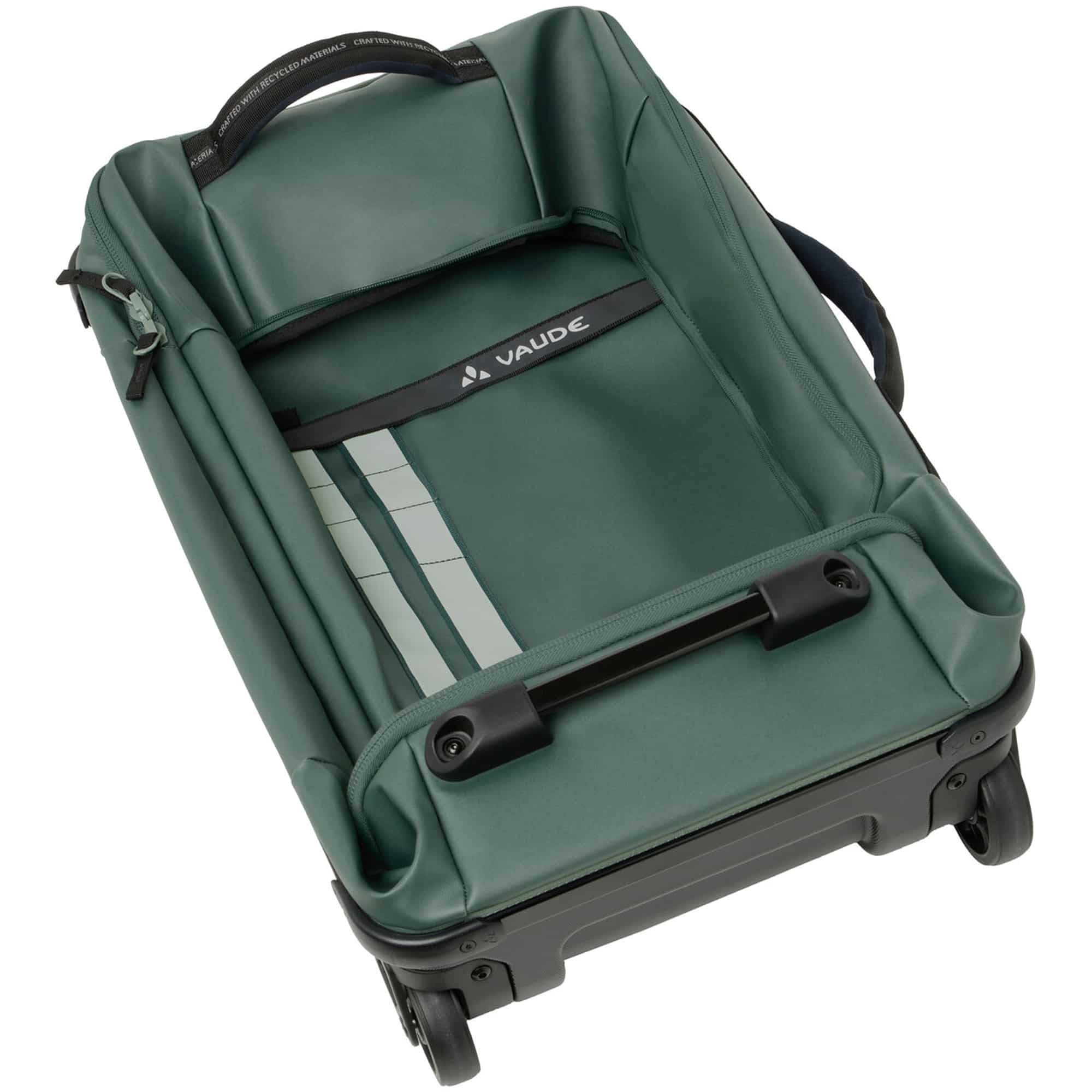 Der VAUDE Takutea 65 ist ein faltbarer Reisetrolley mit 65 Litern Volumen, ideal für Reisen mit leichtem Gepäck. Er punktet mit durchdachter Aufteilung, viel Stauraum, flexibler Nutzung und einem besonders nachhaltigen Aufbau. Im Inneren sorgen Packgurte und ein Netz-Zwischenboden mit Reißverschluss für Ordnung und Struktur. Leicht laufende Gummirollen, ein ausziehbarer Teleskopgriff sowie gepolsterte Tragegriffe an Kurz- und Langseite bieten vielseitige Transportmöglichkeiten. Dank reflektierender Frontstreifen mit Halteschlaufen lassen sich zusätzlich kleinere Gegenstände außen fixieren.
