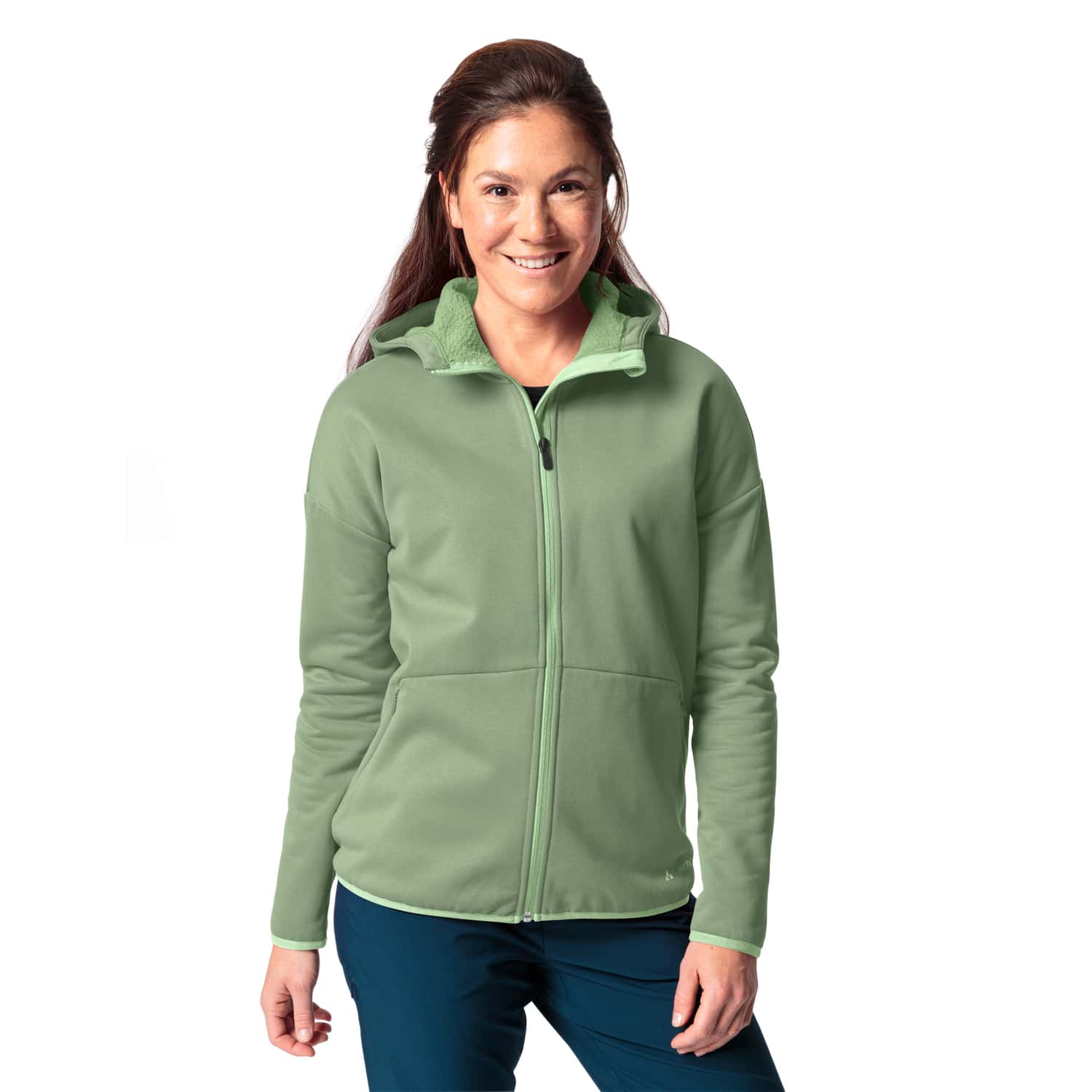 Die Mineo Fleecejacke für Damen von Vaude ist Dein passendes Outfit für den Alltag, besonders an kalten Tagen. Diese leichte, vielseitig einsetzbare Kapuzenjacke ist aus größtenteils recyceltem Material in einem schicken und umweltfreundlichen Gewand gefertigt. Der durchgehende Reißverschluss sorgt dafür, dass Deine Körperwärme erhalten bleibt, während die großen Eingrifftaschen eine sichere Aufbewahrung gewährleisten, sowie die Hände wärmen. Die elastischen Ärmel und Bündchen liegen eng an und garantieren einen angenehmen Tragekomfort. Reflektierende Elemente sorgen für bessere Visibilität, auch wenn Du bei schlechten Lichtverhältnissen unterwegs bist. Das Material ist weich auf der Haut, betont ein angenehmes Tragegefühl und trocknet schnell. Das VAUDE Green Shape Label steht für ein umweltfreundliches, funktionelles Produkt aus nachhaltigen Materialien.